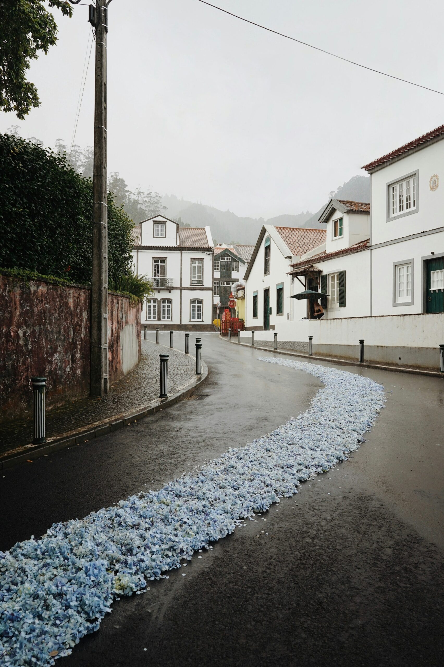A road covered with hydragenia petals during the religious celebration in Furnas, San Miguel, Azores.